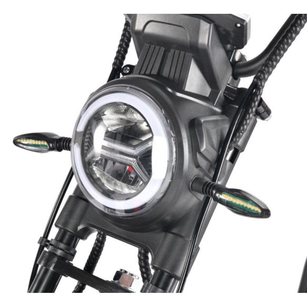 Переднюю линзованную фару, а также стробоскопы и поворотники для заметности на дороге