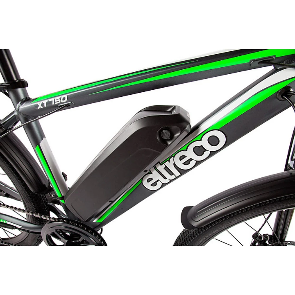 Велогибрид Eltreco XT 750 представляет собой доработанную и улучшенную версию модели ХТ 700. Производители оснастили велосипед  более емким аккумулятором, который обеспечивает запас хода до 50 километров на одном заряде батареи. Расположен аккумулятор под рамой и легко снимается для подзарядки в домашних условиях или офисе. Компактный, но мощный двигатель позволяет развивать скорость до 35 км/час. Такие показатели гарантируют комфортное и мобильное передвижение по городу в течение всего дня. В темное время суток безопасность поездки обеспечивает яркая передняя фара, которая уверенно освещает путь и делает велогибрид заметным для других участников движения. Надежные тормозные колодки с износостойким керамическим покрытием способны быстро остановить транспортное средство даже в экстренной ситуации. Рама выполнена из легкого и прочного алюминиевого сплава и выдерживает нагрузку до 100 килограммов. Пользователи оценят эргономичное сиденье из искусственной кожи и удобные ручки руля, обеспечивающие комфортное положение рук. Велогибрид Eltreco XT 750 отличается стильным и современным дизайном, а его эксплуатационные характеристики позволяют одинаково эффективно использовать его как для поездок по городу, так и для увлекательных загородных велопрогулок.