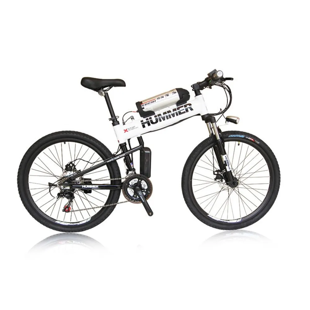 У электровелосипеда HUMMER есть передняя амортизация, повышающая комфортность передвижения. Рама из алюминия складывается, уменьшая габариты вело гибрида вдвое, положить его в багажник автомобиля или убрать на хранение не составит труда.