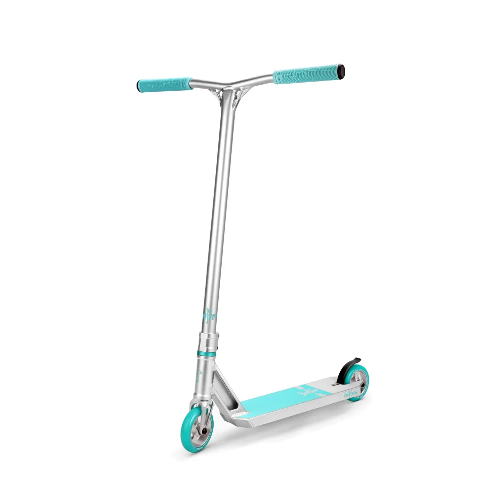 Этот трюковый самокат создан для профессиональной езды в парке. Скоростные колёса диаметром 110 мм, выполнены из алюминия, придают самокату максимальную скорость. Манёвренность и хороший отскок самоката обеспечивает покрытие колёс из полиуретана 88А, имеющих ширину 26 мм. У самоката имеются высококачественные подшипниками АВЕС 9, придающие самокату хороший накат.